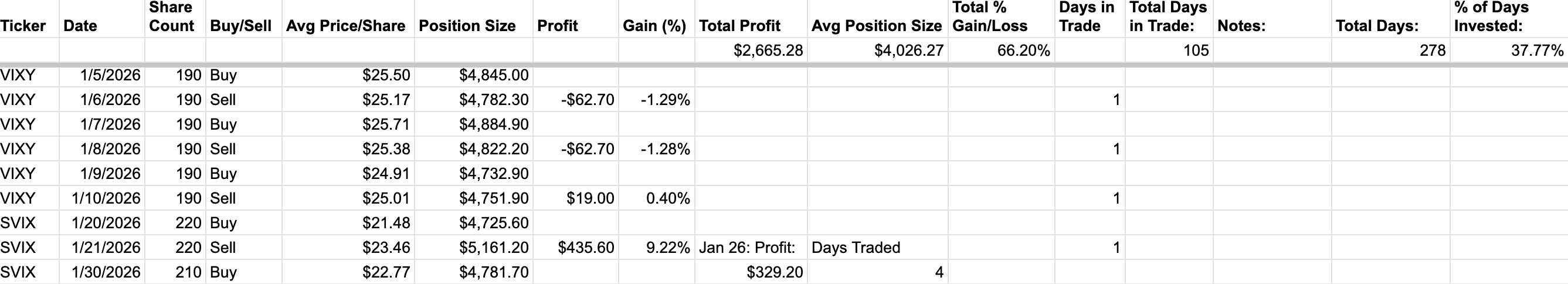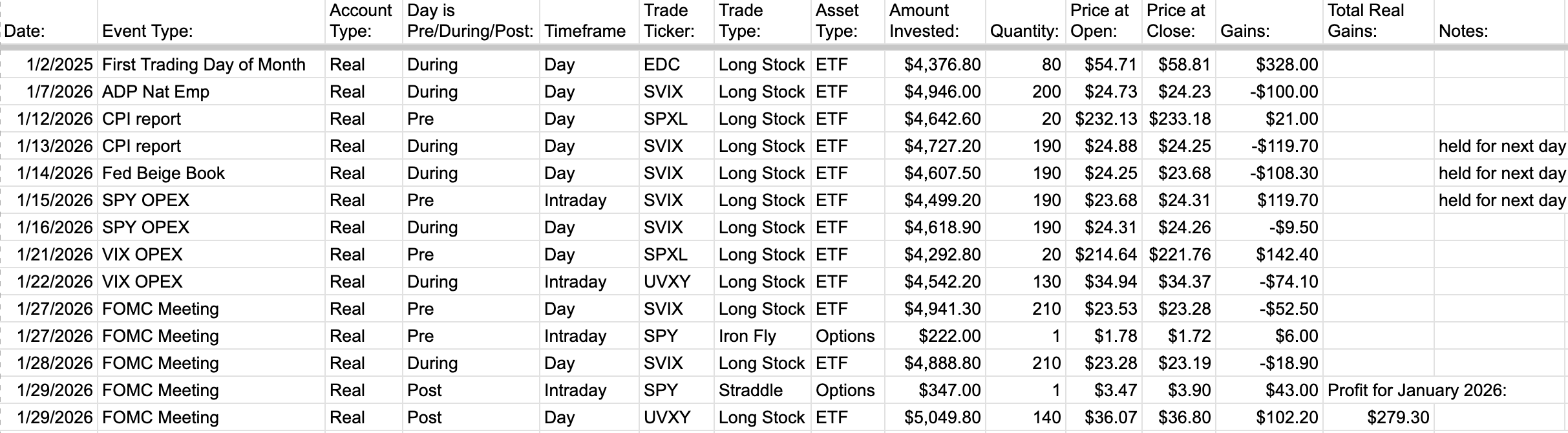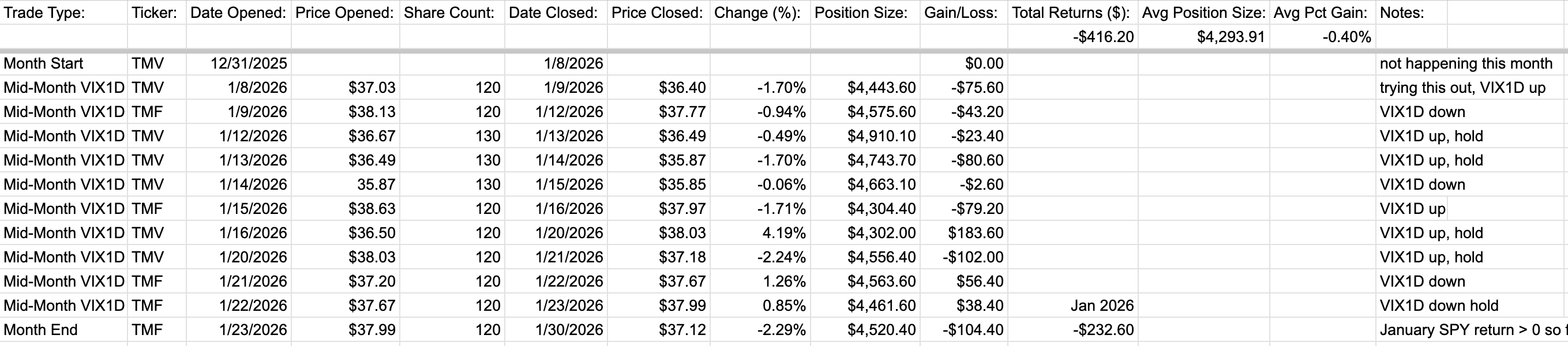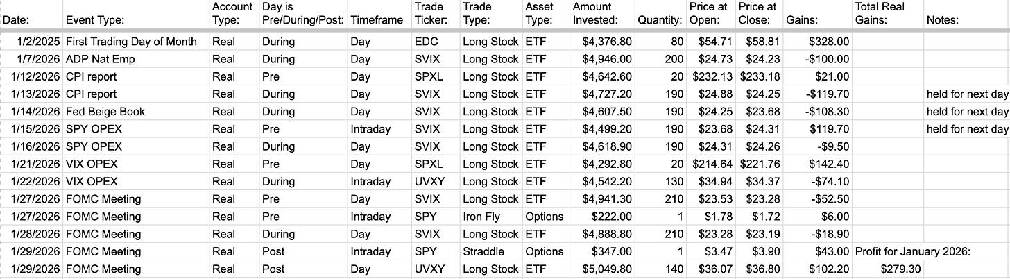 TMF/TMV trades were difficult with the addition of the mid-week trading, adding up to a -$232 loss for January 2026. It was a bit frustrating to see 5+ days of losses in a row for the VIX1D-based mid-month trades, but I think that might just be part of the alpha of the strategy: be willing to endure multiple losses in a row and not tear your own hair out.