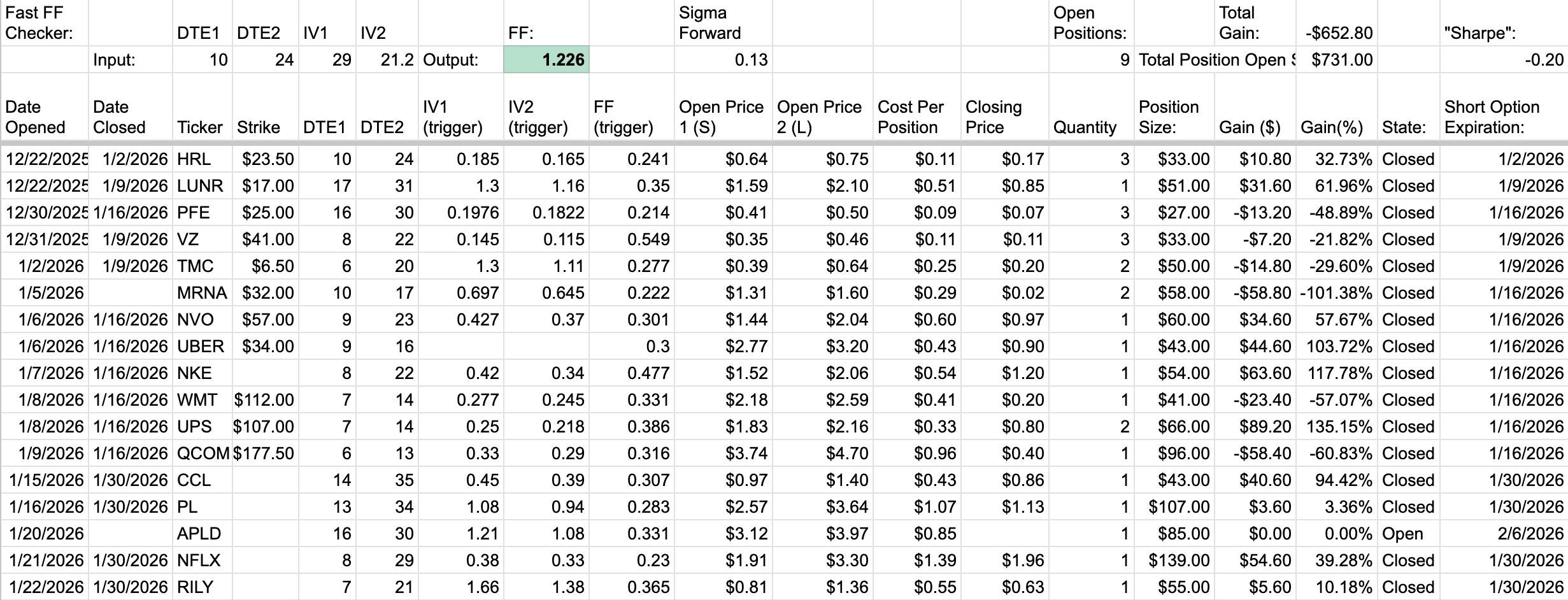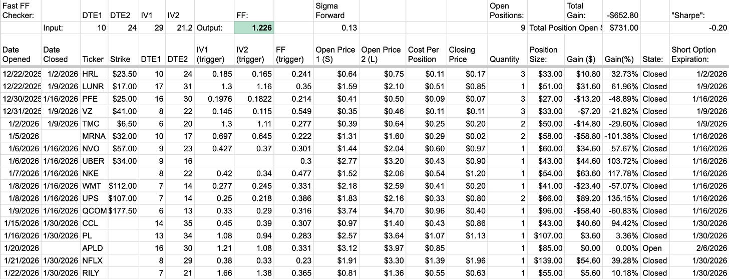 I made a little bit more money in January 2026, working myself out of the hole I’d made at the start of this strategy with a gain of $203 over $956 in positions expiring across the month. I’m thinking that this strategy can’t be a consistent or large allocation due to the difficulty of opening more than $50-$100 of position size per day, but it’s low-stress, low-effort, and potentially profitable over the long term. I also suspect that only doing trades with 0.3-0.4+ Forward Factor levels greatly increases the profitability, but this will take time.