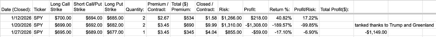 The Friday Iron Fly strategy had its first big loss this January, because I guess the President announced he was going to acquire Greenland by any means necessary and the market tanked? So on January 27th I took a max loss of -$1,149. Not great. Hopefully the strategy will recover in the future.