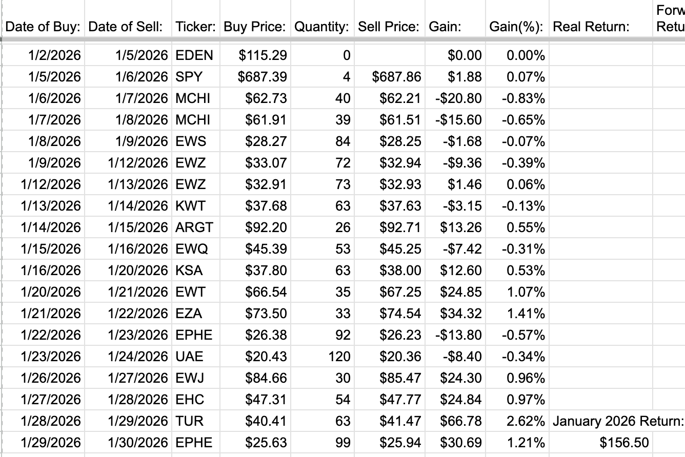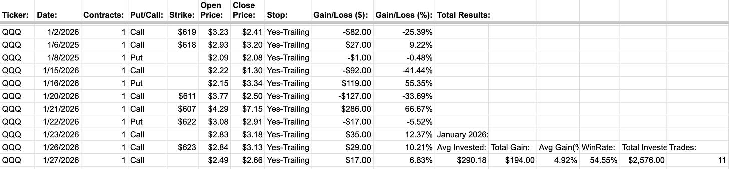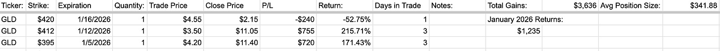 January 2026 returns for the 1DTE GLD trade strategy were $1,235. I’d like to think this strategy will work regardless of whether Gold goes on a generational bull run, but I’m not complaining.
