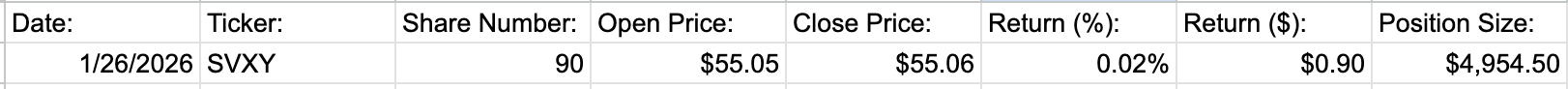 Volatility Reversion conflicted a lot with the Calendar in January, unfortunately, but the 4 days that actually did trade VIXY/SVIX made $329, which is pretty good! The Volatility Reversion strategy is a consistent winner that I’ll maybe increase in position size to 15%-20% of the portfolio in the future.