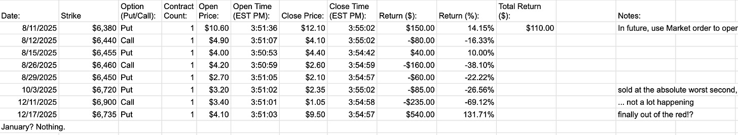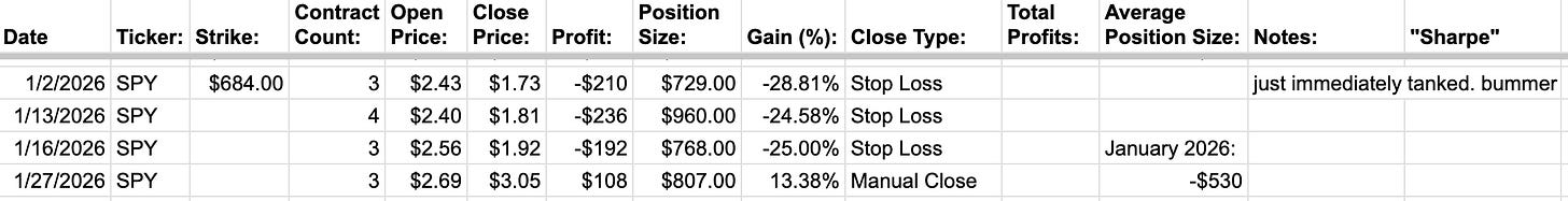 Vibe-traded Tuesday+Friday SPY calls had a horrible January, losing -$530. Not great, and all the losses were fast stop losses that I couldn’t really lie to myself about not closing earlier. Hopefully February is better.