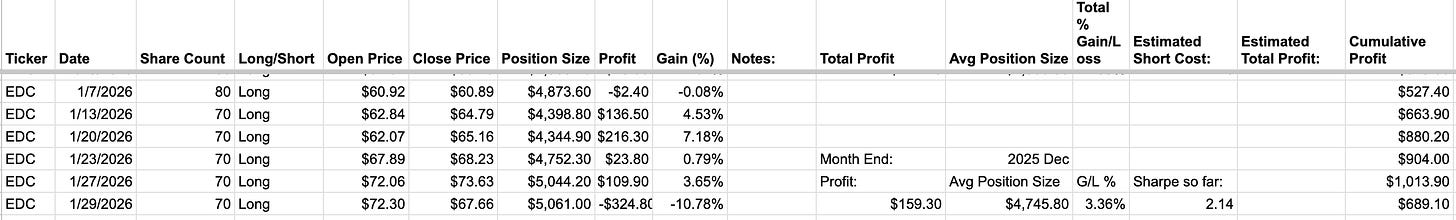 the EDC trade was going great until the January 30th when it suffered a -$300+ loss in 1 day, but the strategy still managed to make $159 for the month of January. So that’s nice.