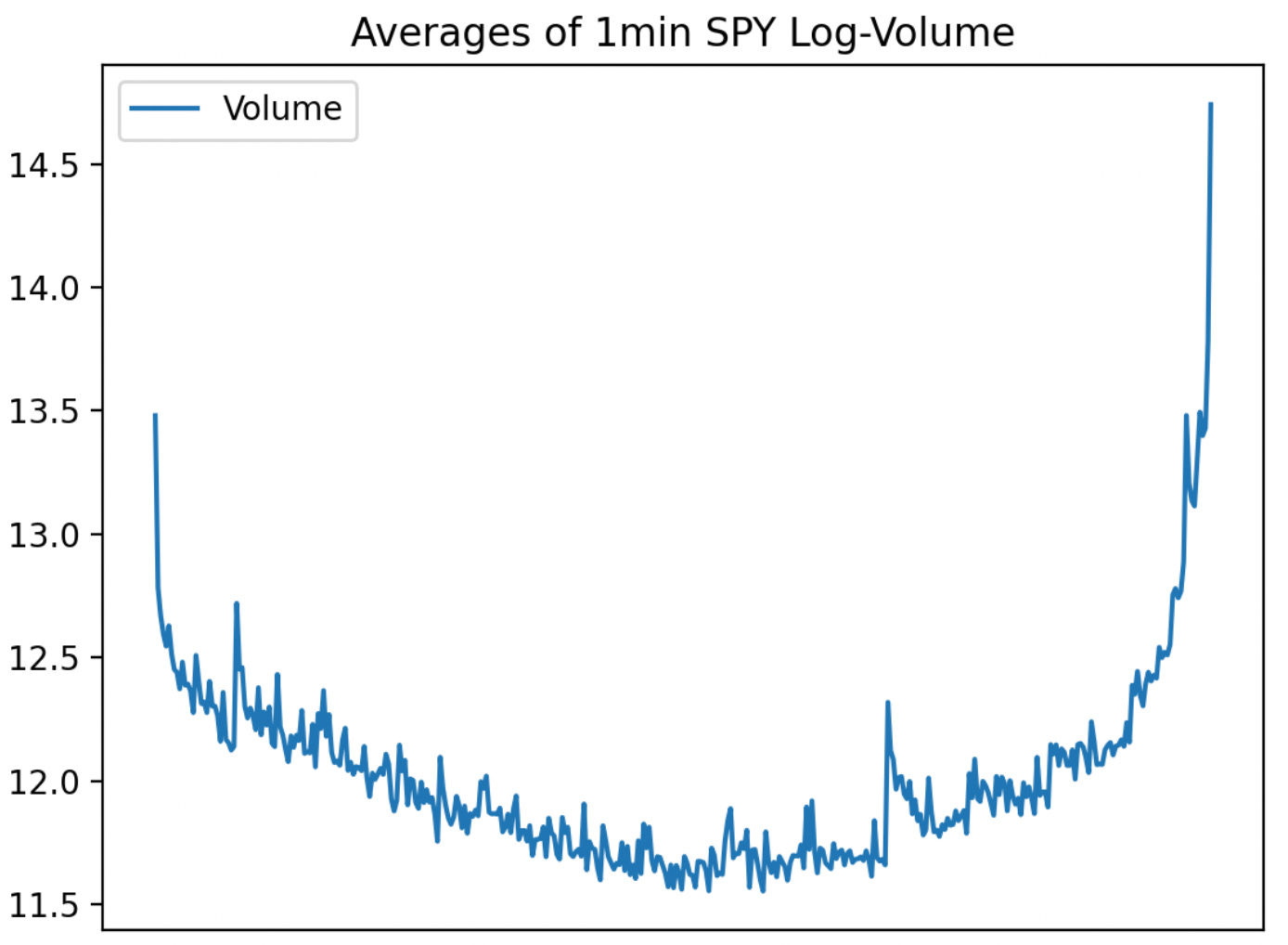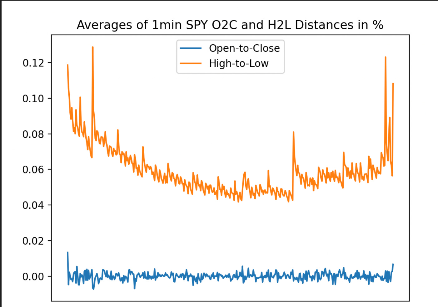 We can see below from the Average Difference (in percent) between Open and Close, as well as High and Low prices of SPY at 1 minute intervals is higher at the open and the close. Volume in terms of raw share count is distributed similarly. Data below is from 2022-2024.