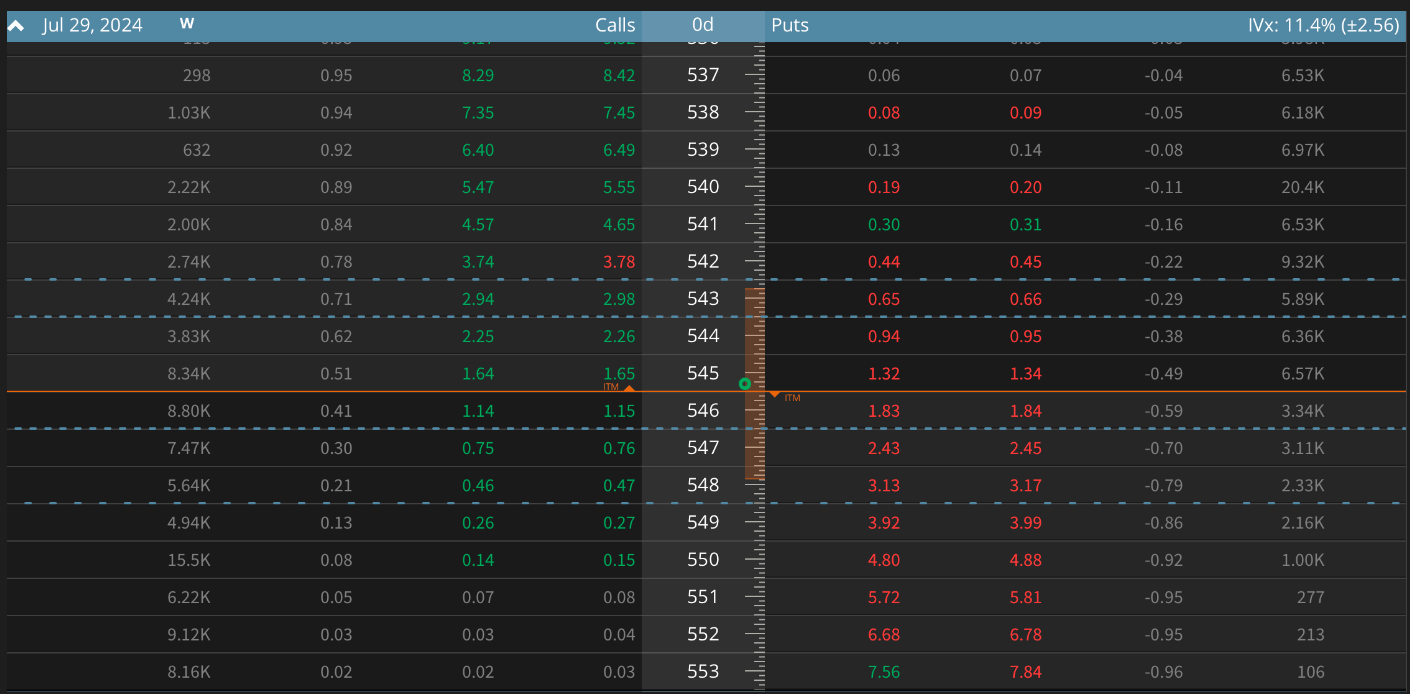 The above snapshot was taken at 9:17am on 7/29/2024. This is an option chain of 0DTE calls and puts for the SPY, listing Bid, Ask, Delta, and Open Interest for the day. Note that Put Bid and Ask prices for the $541 strike ($0.30) are double the price of the similarly out-of-the-money $550 strike ($0.15).