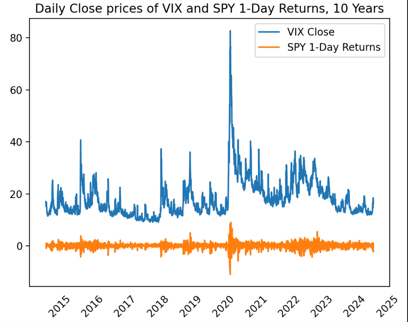 Because volatility tends to cluster together, it makes sense to classify Volatility into "Regimes", ranges of days where Volatility is high/low and increasing/decreasing, etc. This is especially important for figuring out whether the options we want to buy and sell are over or under-priced. We can see looking over the past 10 years that the VIX and VVIX tend to spike together at the daily level, though the VVIX moves can be more extreme. And the daily VIX and the magnitude of SPY returns are correlated.