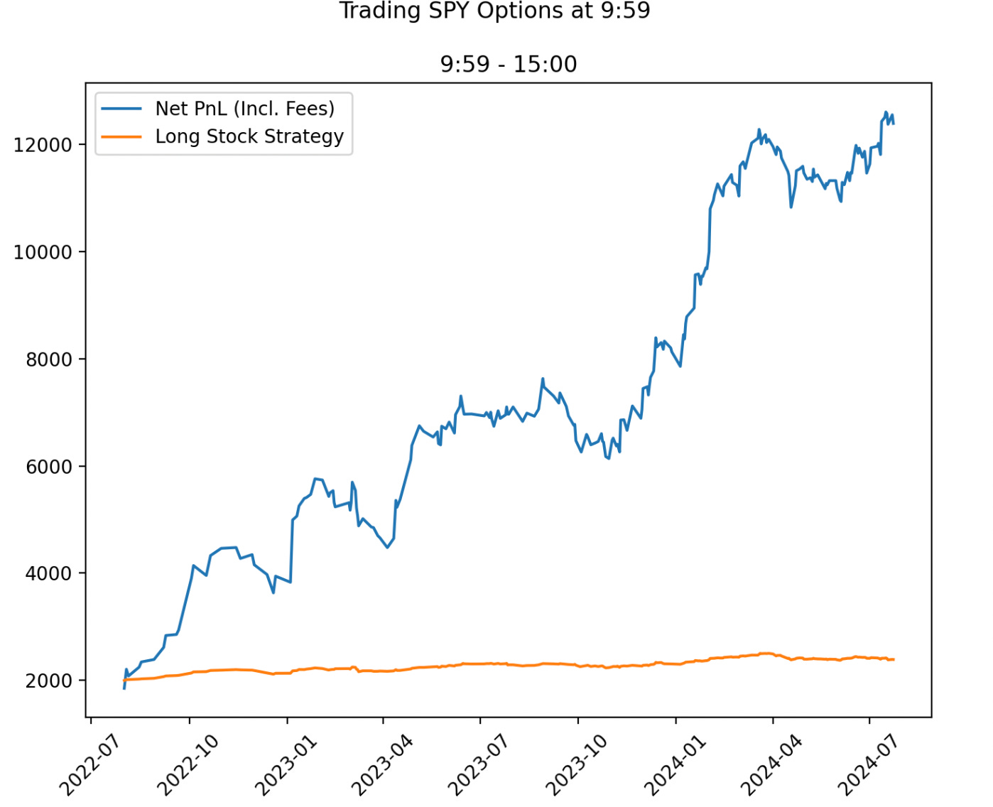 Running this combination strategy since 2022-08-01 to 2022-07-25 with a $2000 starting starting portfolio and 2 contracts would have been quite profitable, and only invested approximately 35% of the period's total trading days. The strategy greatly outperforms holding the stock long with a full portfolio instead (19% return) during the same trade dates and market hours.