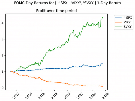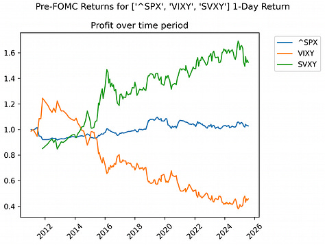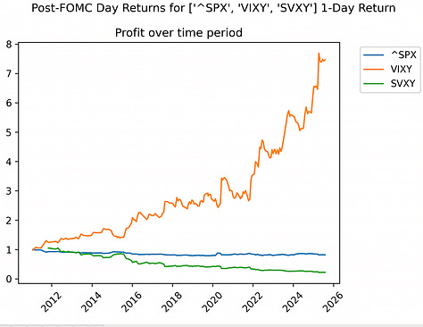 I was pleasantly surprised that the post-FOMC day VIXY trade works as well as it does, since VIXY is a messy, messy ETF that decays over time.